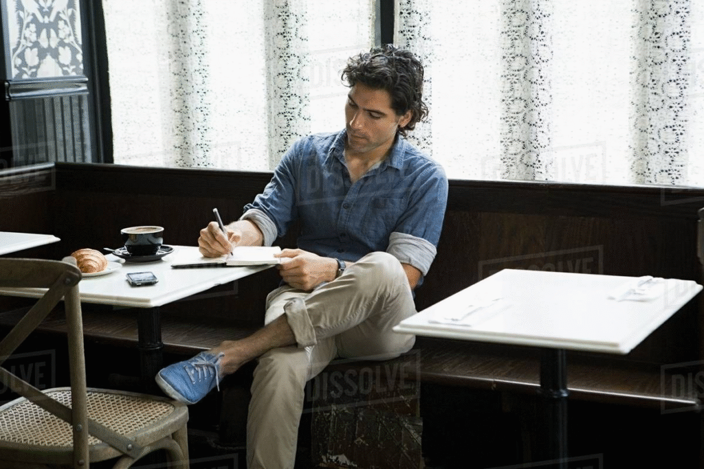 A poet in a heavy coat sits beneath a leafless tree, tearing yesterday’s page from his notebook.