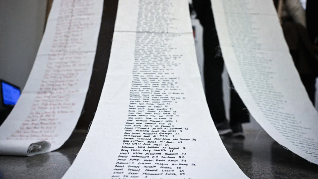Somewhere behind me, the exhibition still glowed, images of Gaza burning softly in the dark.
